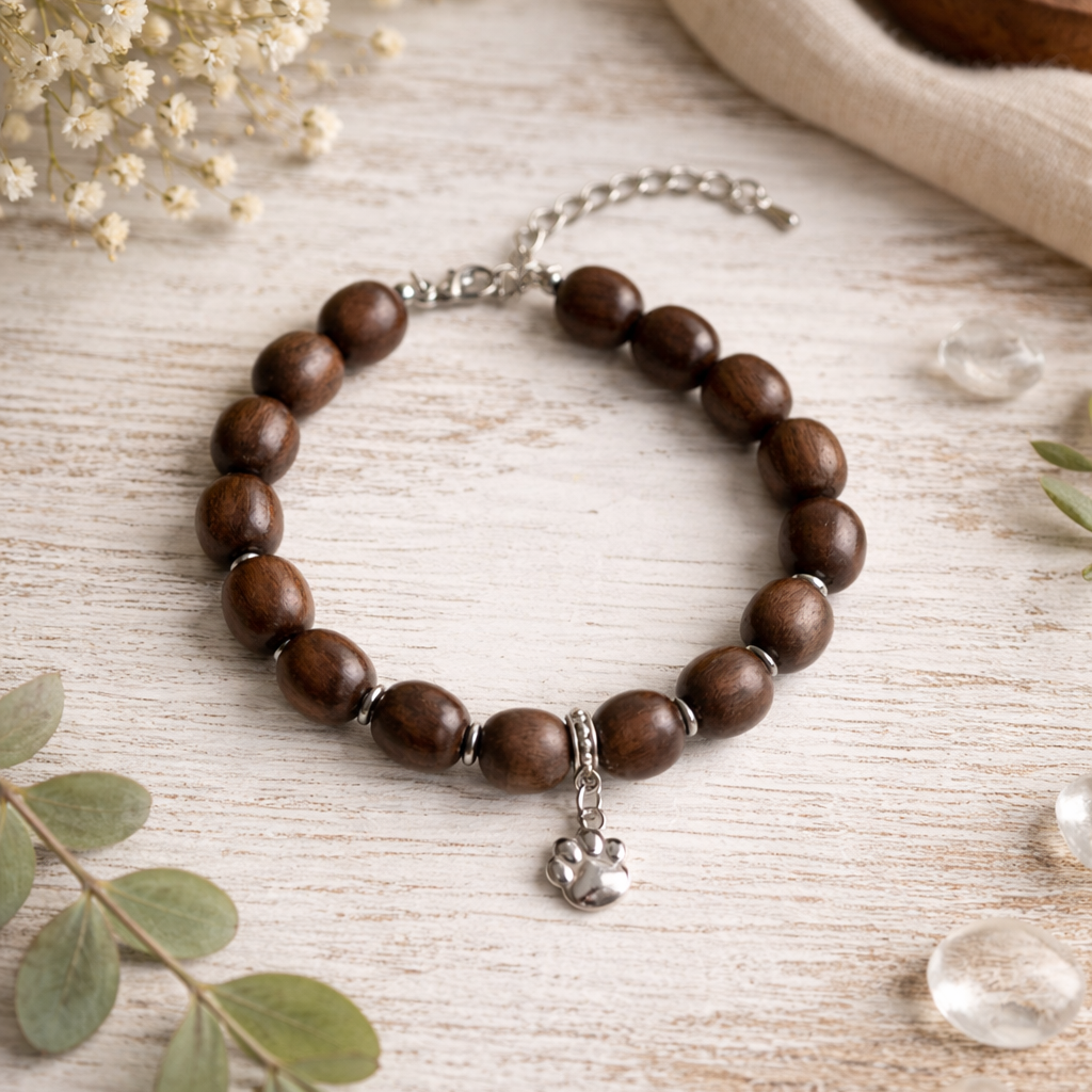 The bracelet is made of walnut wood beads, handcrafted by me, with simple minimalist hardware.