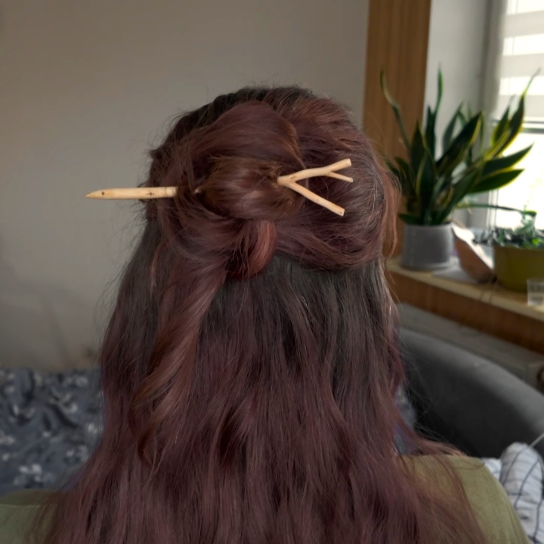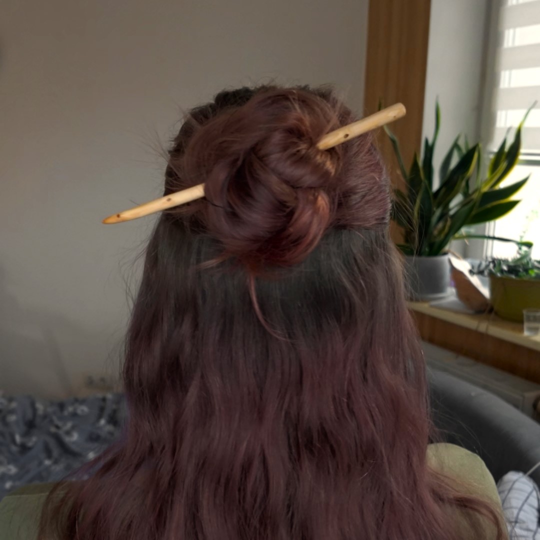 A simple, natural wooden hair stick hand-carved from real juniper grown in our own garden.